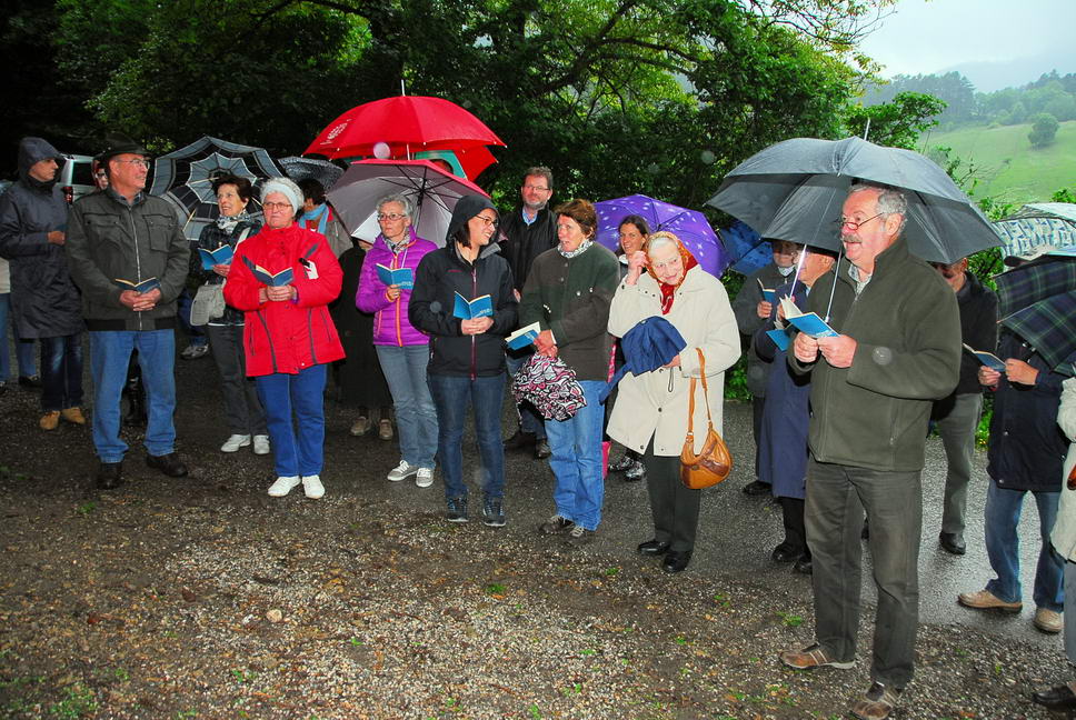Trotz Regenwetter fanden sich zahlreiche Nachbarn und Bewohner Schrattenbachs ein, um bei der Segnung des Kreuzes durch Pfarrer Wolfgang Berger dabei zu sein.